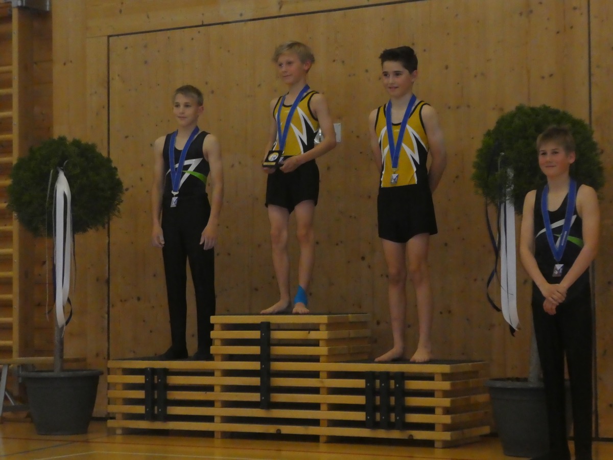 Am Nachmittag absolvierten die K3 und K4 Turner ihren Wettkampf. Auch sie zeigten einen guten bis sehr guten und sturzfreien Wettkampf. Die beiden K4 Turner Lars und Joris mussten sich, ebenfalls zum ersten Mal, den sehr schwierigen Übungen in dieser Kategorie stellen. Sie erreichten konstant gute Noten im Bereich 8.50, was noch nicht ganz für die Spitzenpositionen reichte. Joris hatte zudem noch ein Übungsfehler am Boden zu beklagen. Die bereits guten Noten am Reck, Lars 9.10, Joris 8.80, lassen jedoch zuversichtlich und positiv auf die nächsten Wettkämpfe schauen. Sensationell lief es den K3 Tunern, alle konnten sich in der ersten Ranglistenhälfte platzieren. Leandro konnte den Wettkampf sogar gewinnen und sich zu oberst auf dem Podest die Goldmedaille umhängen lassen. Ihm folgte Manuel auf dem 3. Rang mit der Bronzemedaille und Lias auf dem 6. Rang. Der Grundstein des Erfolgs konnten sie mit folgenden Top-Noten legen, Leandro Reck 9.55 Ring 9.30 Sprung 9.20, Manuel Ring 9.15 Barren 9.10 Boden 9.05, Lias Reck 9.10. Super Leistung.
