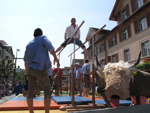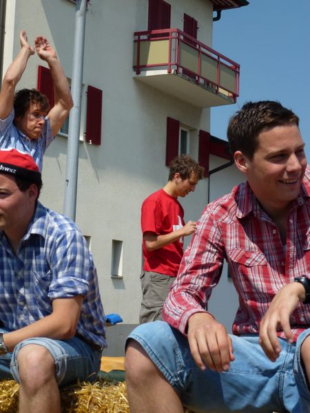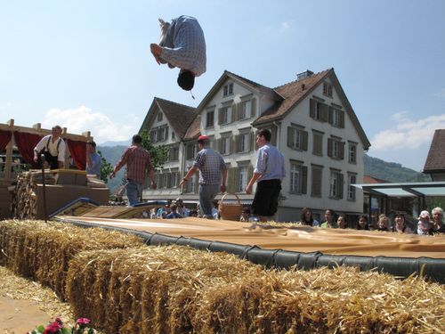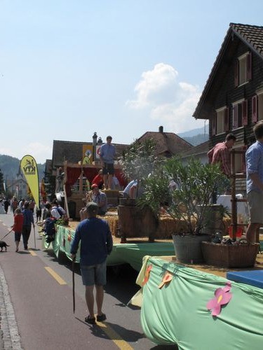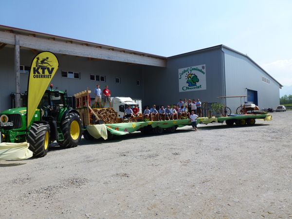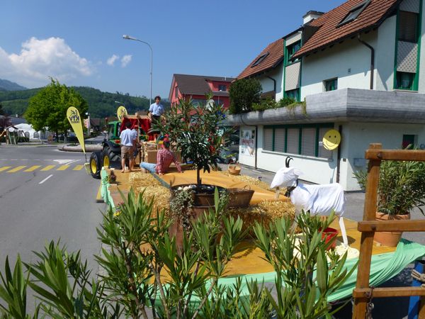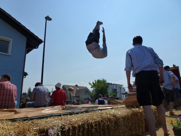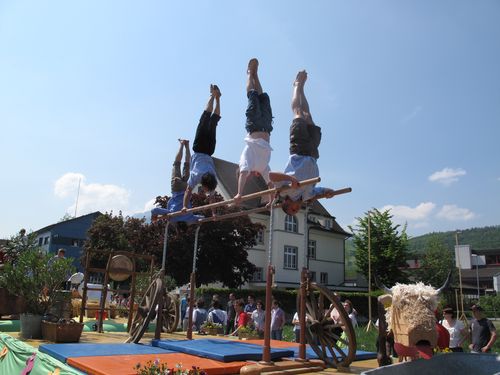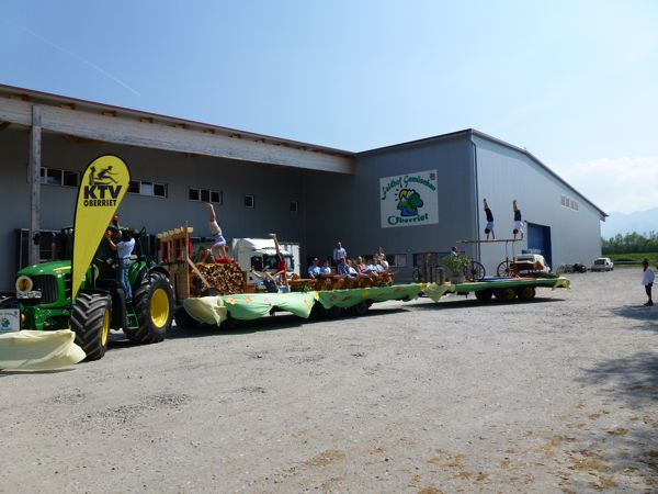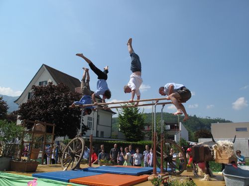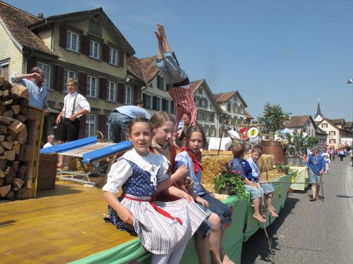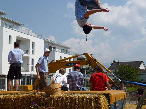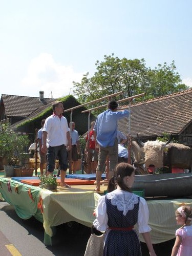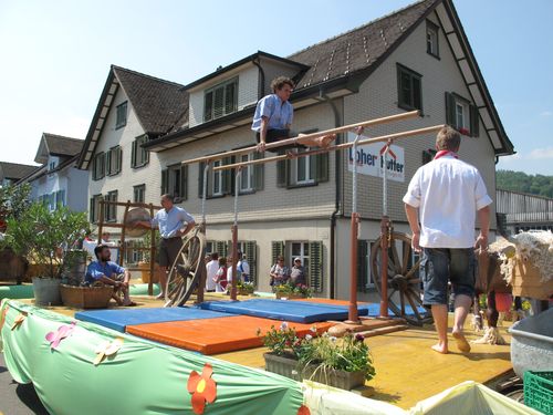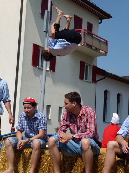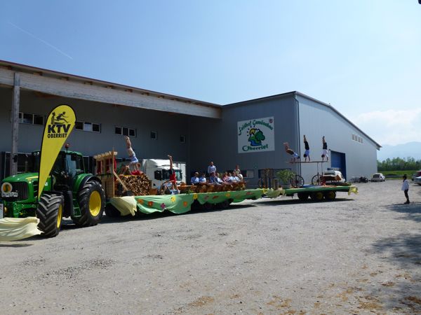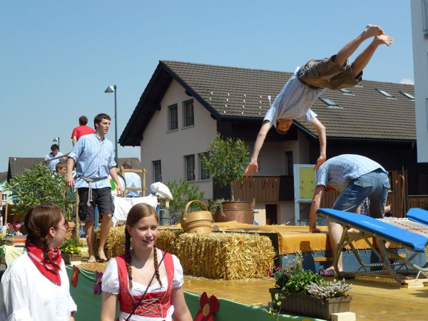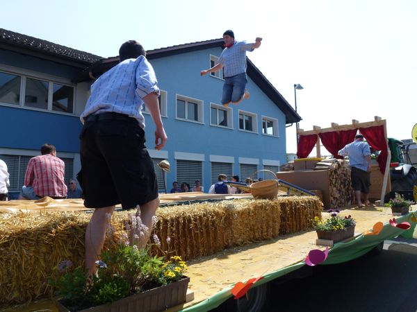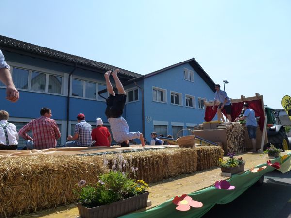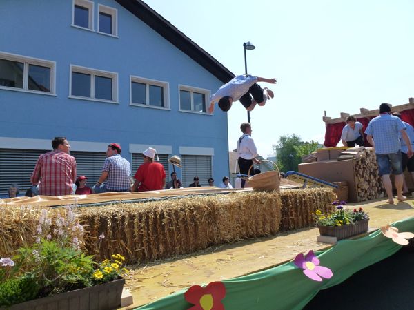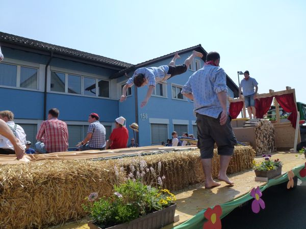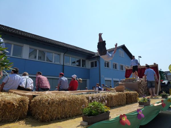 Ein weiterer Hingucker war natürlich der riesige Traktor mit seinen zwei kolossalen Anhängern. Auf dem ersten Anhänger wurde ein Trampolin samt Matte montiert, von welchem die Aktivriege dem zahlreichen Publikum eine Kostprobe ihres gewaltigen Sprungsortiments zum Besten gab. Auf dem hintern Anhänger stand neben der gebastelteten Kuh der Barren. Auf diesem konnte man die atemberaubenden Turnübungen mitverfolgen, während sich der Traktor seinen Weg Richtung Burgwies bahnte. Da dieses konstruierte Gefährt enorme Abmasse aufwies, konnte der Burgwies- Platz leider nicht passiert werden.