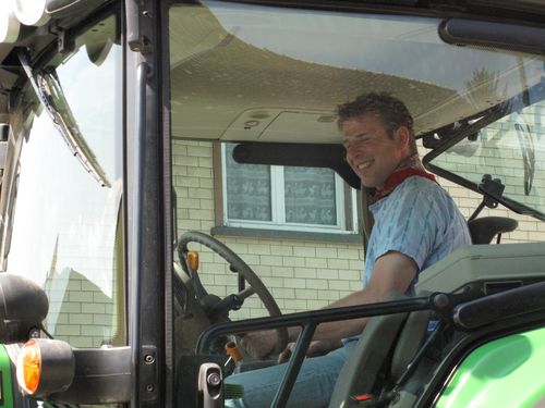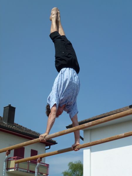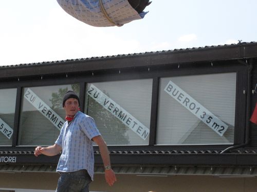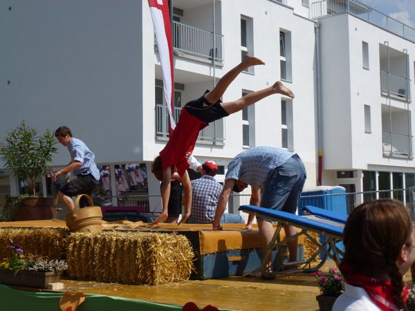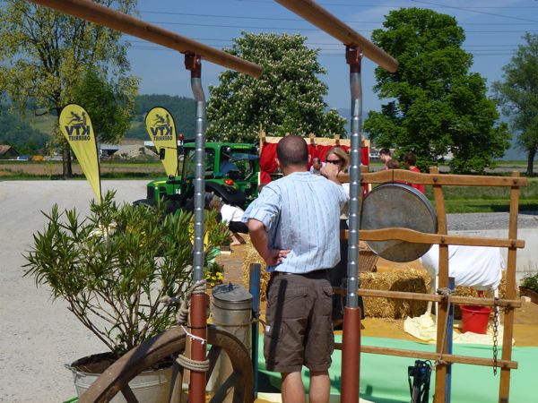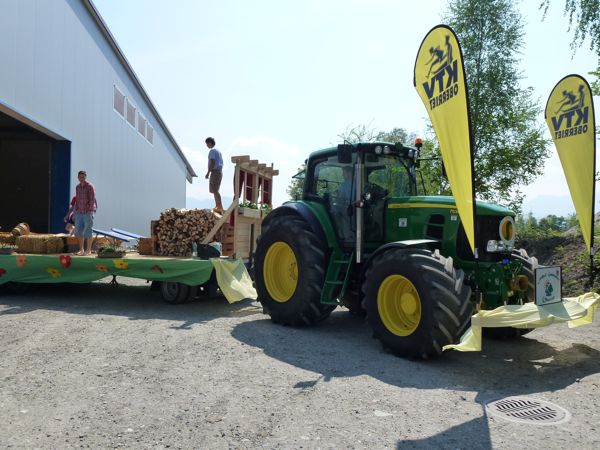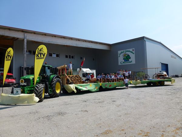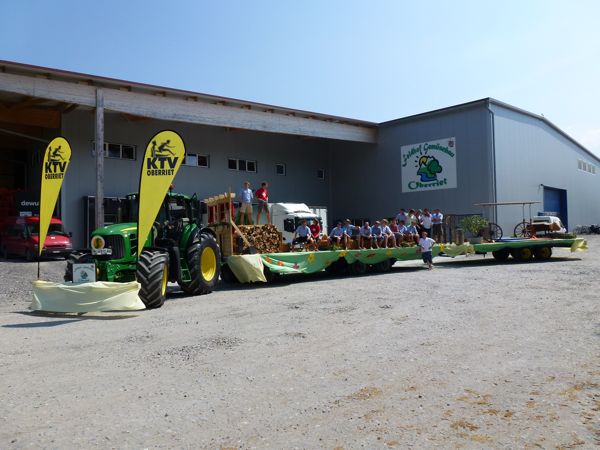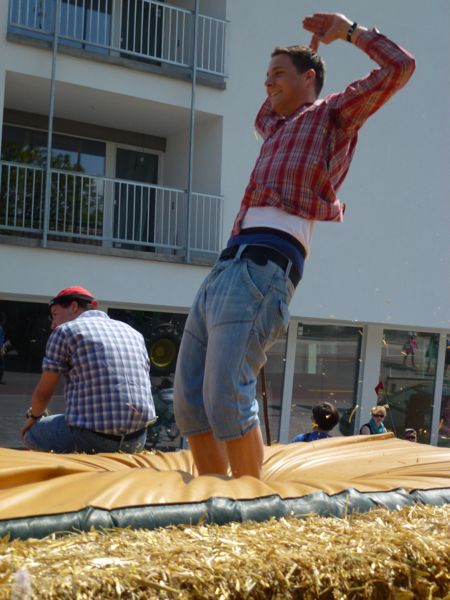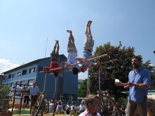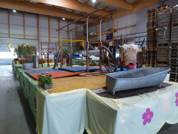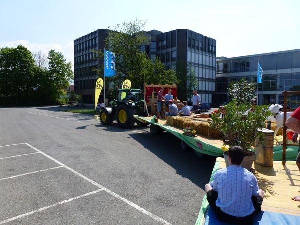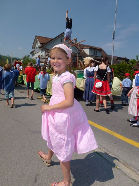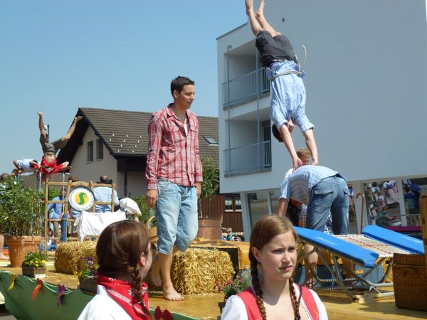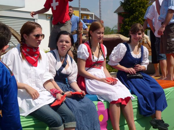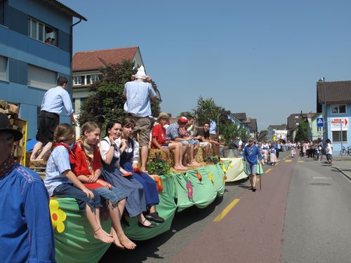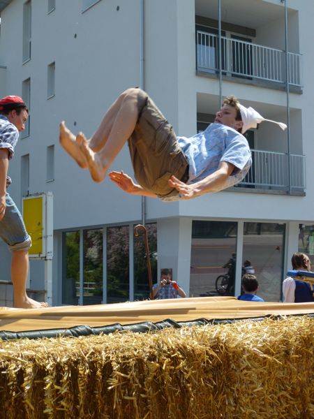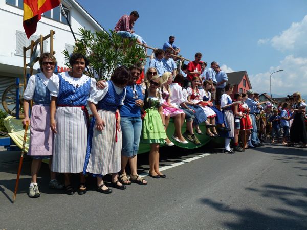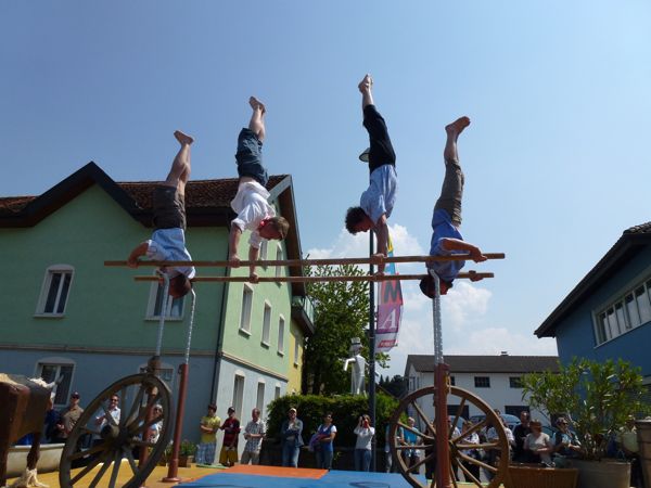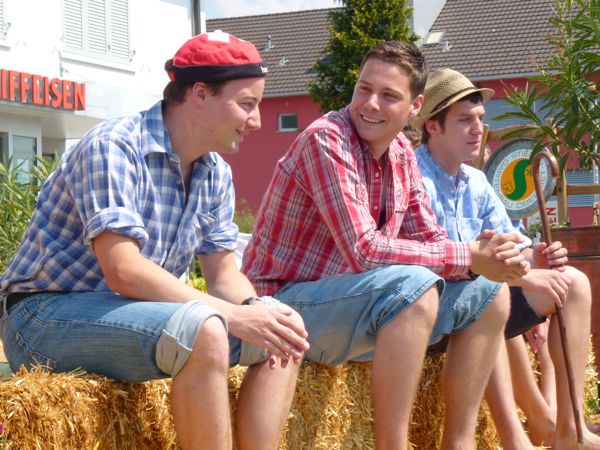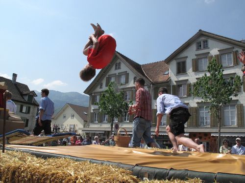 Ein weiterer Hingucker war natürlich der riesige Traktor mit seinen zwei kolossalen Anhängern. Auf dem ersten Anhänger wurde ein Trampolin samt Matte montiert, von welchem die Aktivriege dem zahlreichen Publikum eine Kostprobe ihres gewaltigen Sprungsortiments zum Besten gab. Auf dem hintern Anhänger stand neben der gebastelteten Kuh der Barren. Auf diesem konnte man die atemberaubenden Turnübungen mitverfolgen, während sich der Traktor seinen Weg Richtung Burgwies bahnte. Da dieses konstruierte Gefährt enorme Abmasse aufwies, konnte der Burgwies- Platz leider nicht passiert werden.