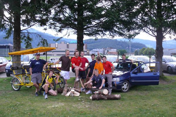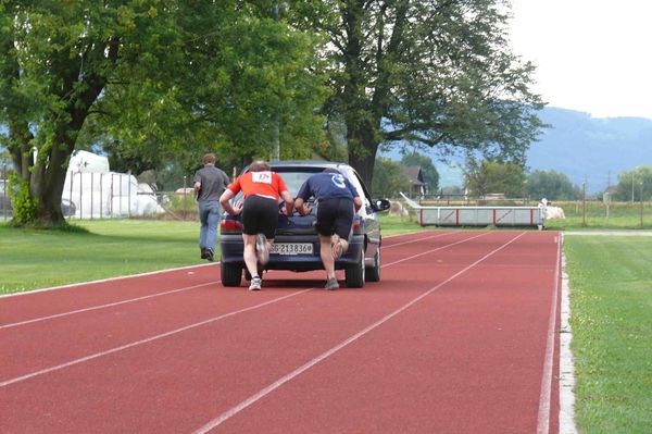 Als zweite Disziplin stand mit dem „Auto-Stossen“ ein wahrer Kraftakt auf dem Programm. Hier ging es darum, ein Auto möglichst schnell 80 Meter weit zu stossen. Vor allem die ersten Meter, bis das Auto in Schwung gebracht wurde, verlangten totalen Krafteinsatz von allen. Gegen das Ende hin wurden dann zum Teil beachtliche Geschwindigkeiten erzielt, so dass manch einer das Auto davon ziehen lassen musste. Diese Taktik erwies sich allerdings als gar nicht so schlecht, gewann doch das Team „Hess/Rico“ diese Disziplin, obwohl Rico’s Beine bereits nach 60 Meter vom Tempo überfordert waren.