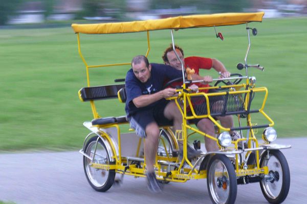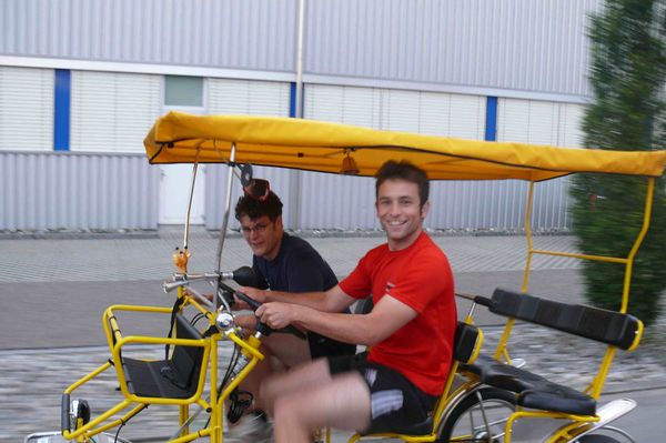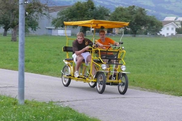 Obwohl nach dem Steinstossen die meisten Turner mit den Gedanken bereits beim wohlverdienten Bier waren, stand zum Abschluss noch der ultimative Härtetest auf dem Programm: Eine Jansenrunde mit einer Art Fahrrad (keine Ahnung wie sich das komische Ding nennt). Obwohl die Distanz mit ca. 1300m für solch durchtrainierte Athleten eigentlich kein Problem darstellen dürfte, führte der Umstand, dass die Übersetzung dieses Gefährts ein wenig zu klein geraten ist, zu total übersäuerten Oberschenkeln. Der Sieg in dieser abschliessenden Disziplin ging wenig überraschend an das Duo „Stefan/Küaf“, welche die Konkurrenz regelrecht in Grund und Boden fuhren.